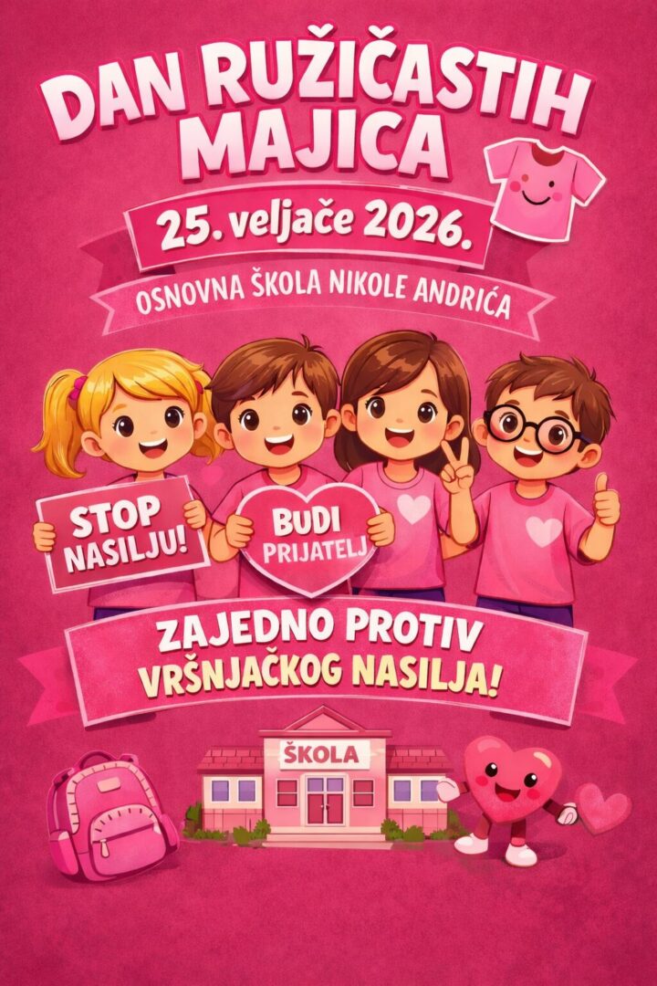 I ove godine pozivamo sve učenike i učitelje da u srijedu, 25. veljače 2026. obuku ružičaste majice kao simbol borbe protiv vršnjačkog nasilja. Moguće je obući i ružičaste hlače, vestu i/ili neki ružičasti dodatak poput marame, šala, sata, narukvice, naušnica, gumice za kosu, broša i sl.