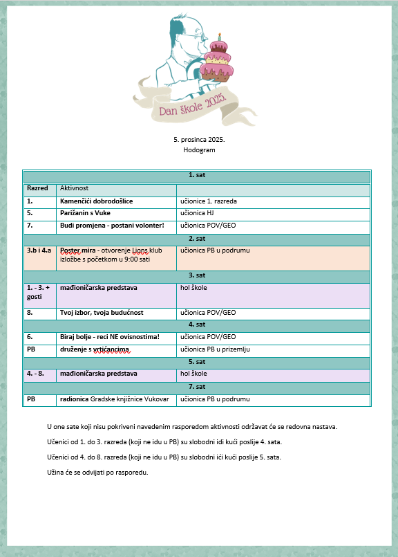 u petak, 5. 12. 2025. obilježavamo dan škole. I ove godine donosimo vam bogat program stoga vas molimo da svakako pogledate hodogram kako biste znali gdje trebate biti u pojedinim satima.