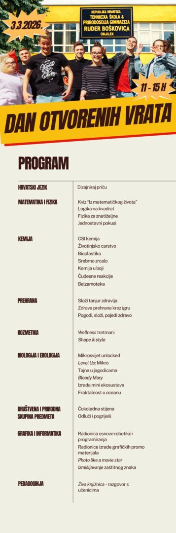 Tehnička škola i prirodoslovna gimnazija Ruđera Boškovića iz Osijeka organizira Dan otvorenih vrata te Vas poziva da obavijestite zainteresirane učenike, roditelje i nastavnike.