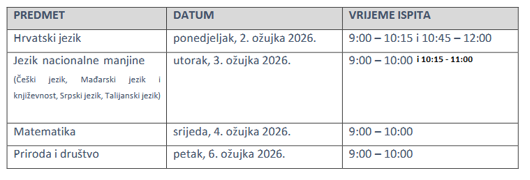 od idućeg tjedna započinjemo s provedbom nacionalnih ispita u 4. razredima. Učenici će nacionalne ispite pisati po sljedećem rasporedu: