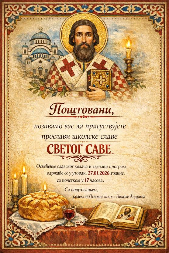 Pozivamo vas na proslavu školske slave Svetog Save koja će se održati u utorak, 27. siječnja u 17 sati u holu naše škole.