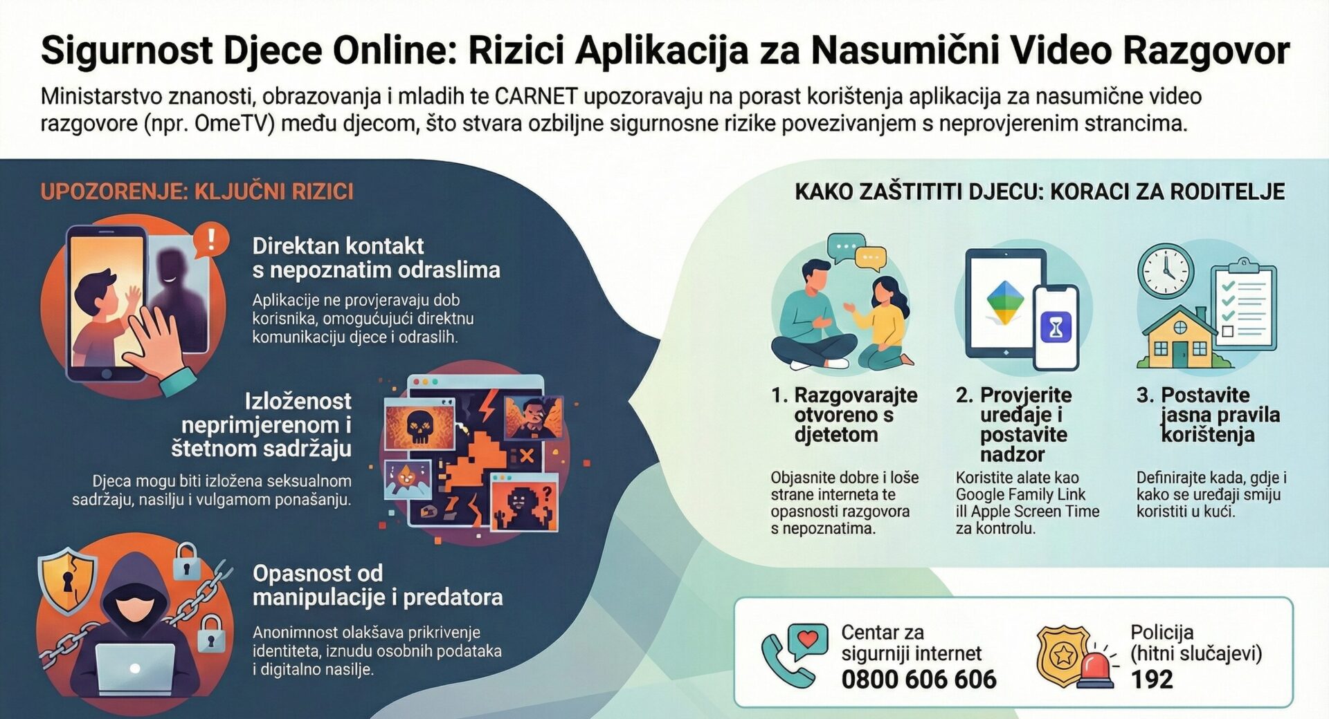 željeli bismo Vas upozoriti na rizike povezane s aplikacijama i web-platformama za nasumične video razgovore, kao što su OmeTV, Chatrandom, Emerald Chat, Monkey, Bazoocam i slične.